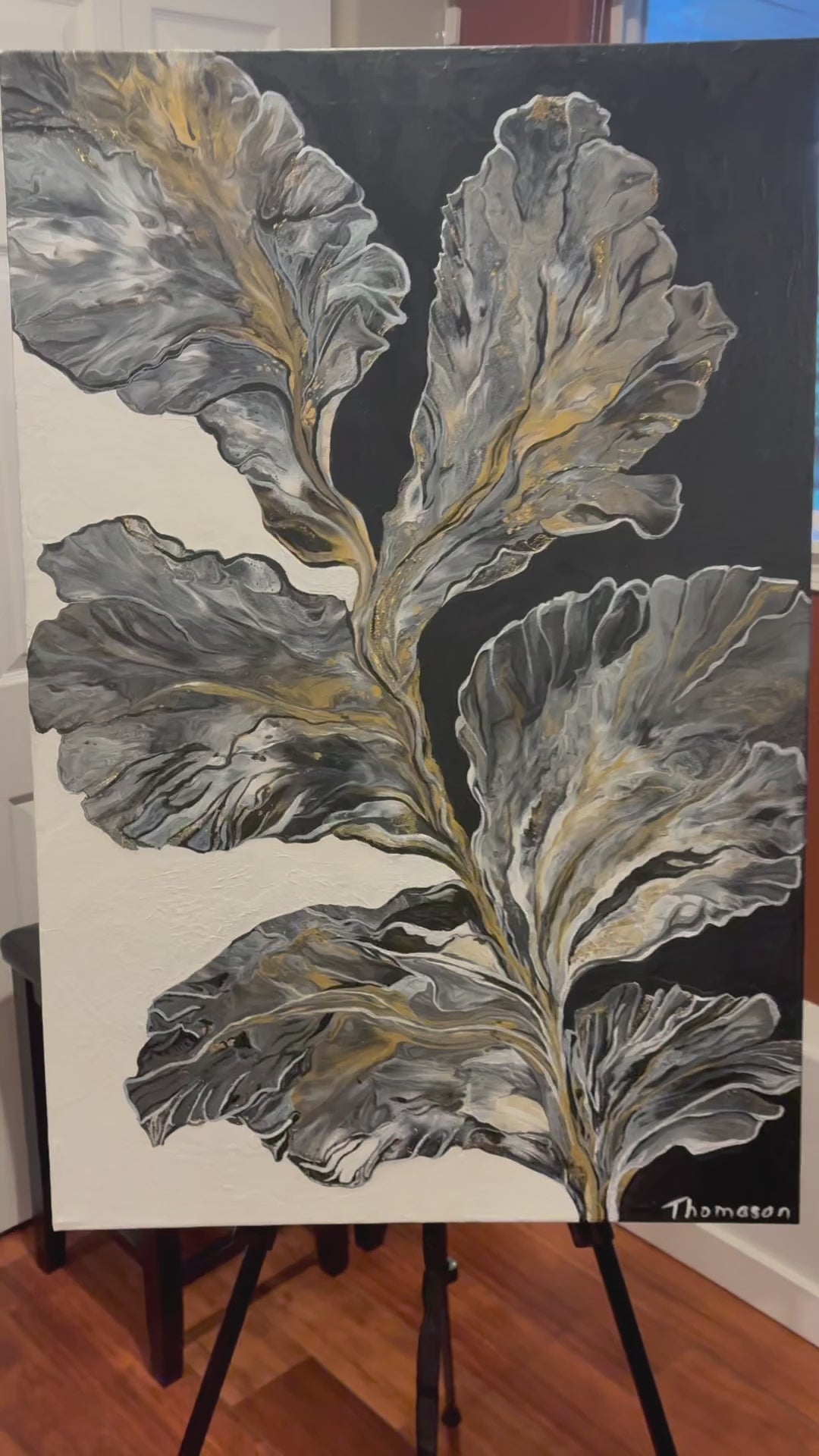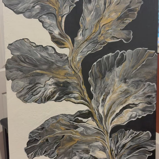 The background, split between a solid, stark black, and a bright, stark white makes the intricate, flowing structure of the plant stand out powerfully. Defined by fluid movement, the paint appears to be flowing outward from a central stem, giving the leaves a natural, organic look.