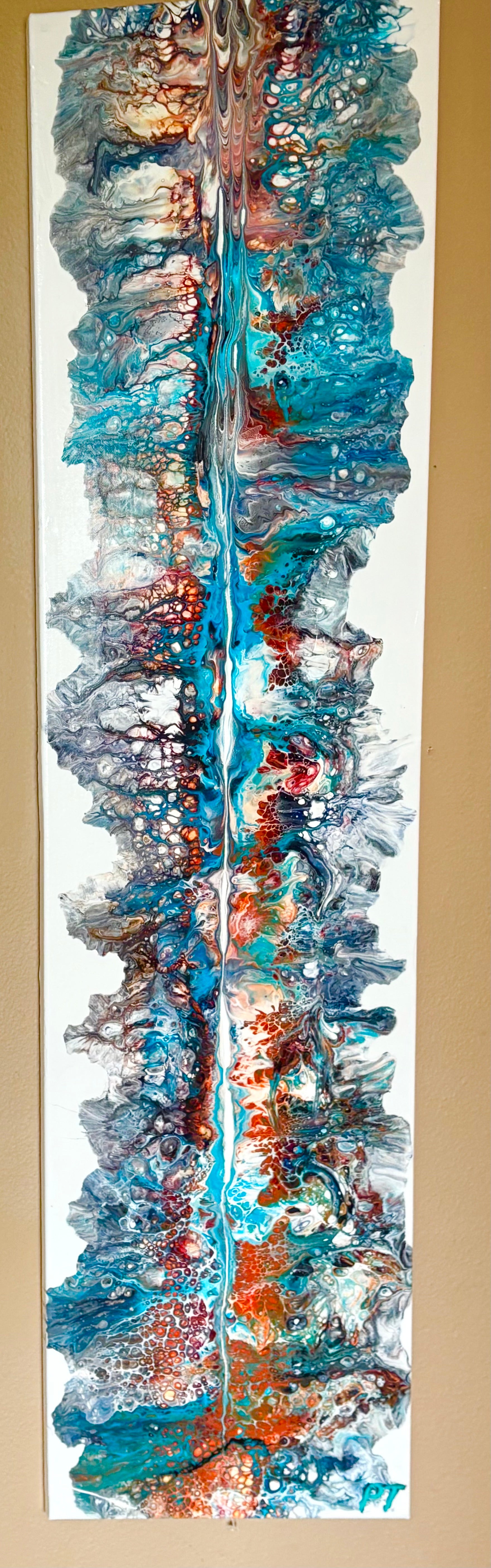 This abstract piece provides a plethora of elaborated over copper, turquoise, blue, and black on white base. The artwork has a double varnish gloss finish, and is 12" x 48". Perfect for a hallway length-wise and equally stunning along a wall horizontally and resembles the reflection of trees on a lake.