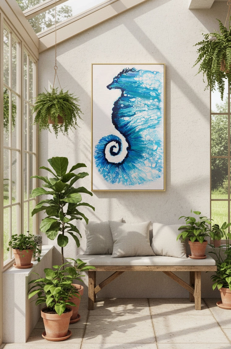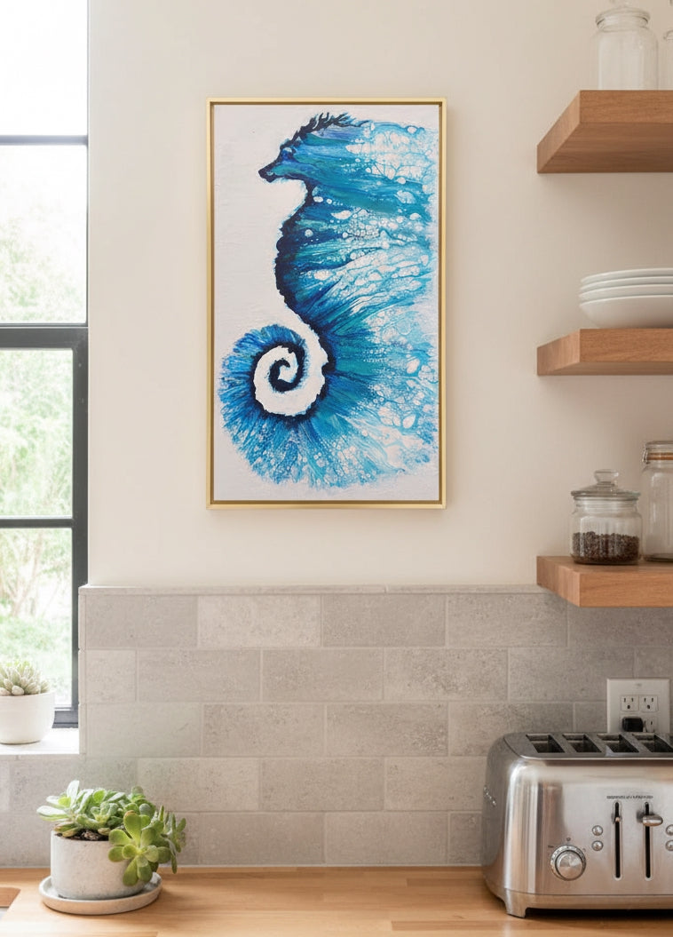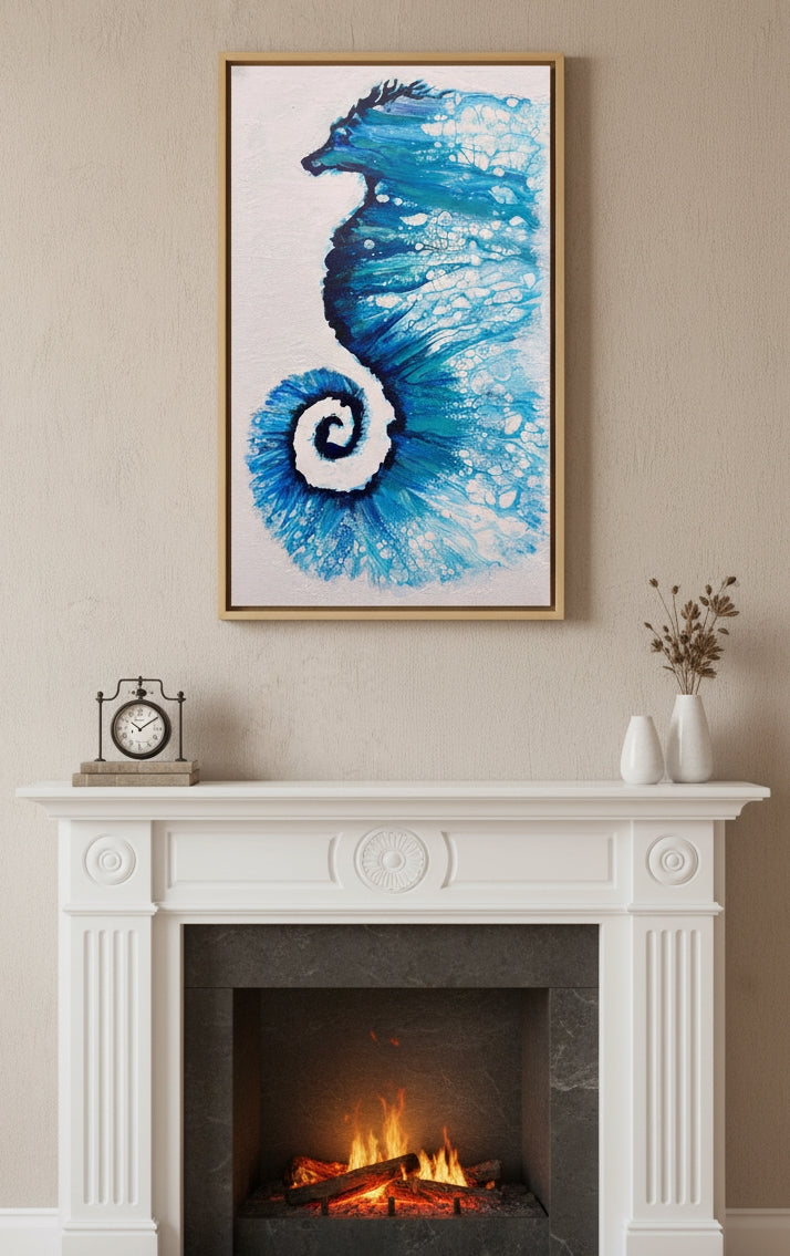 The acrylic pour itself creates a sense of uncontrolled, vibrant energy, Within the seahorse's shape, the paint forms lacing and cells—tiny, bubble-like structures—that look like they are caught in a powerful current. The dramatic, tightly coiled tail acts as a vortex or epicenter, from which the blue energy seems to explode outward. The creature feels suspended in a dynamic, possibly zero-gravity environment, like a nebula in space rather than a creature in the sea.