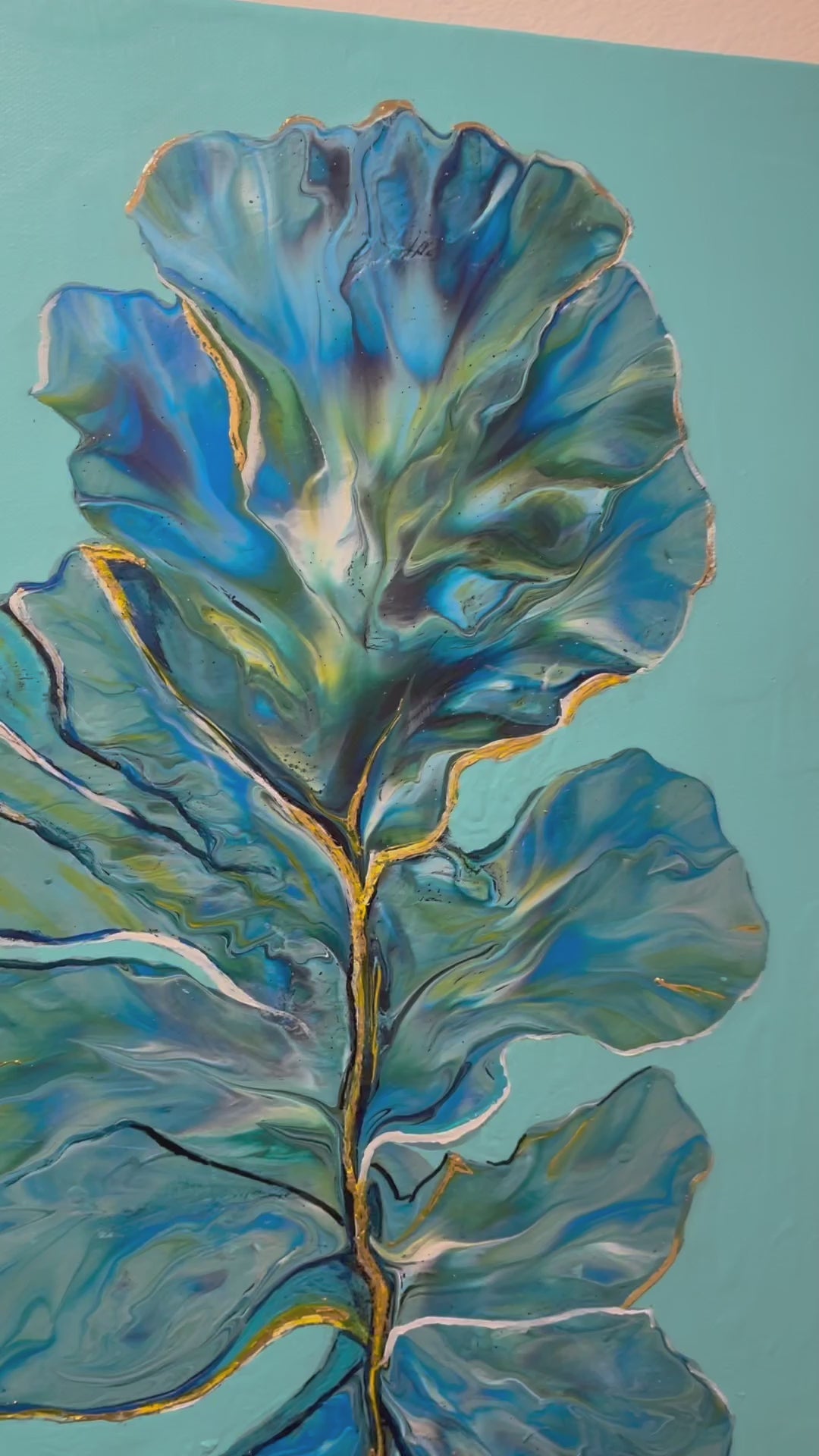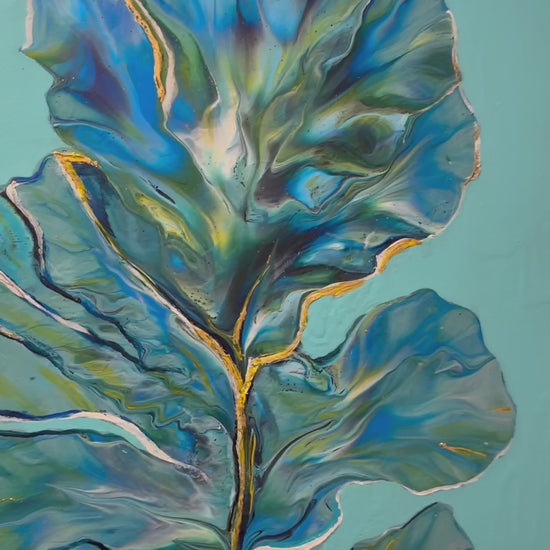 Restricting the palette almost entirely to blues and teals creates a dreamlike state. It is visualized in the cool, calming, and limitless space of the subconscious mind.The fluid art technique makes the leaves appear solidified waves or plumes of liquid light. High gloss and merging colors give the sense that the object is in a perpetual state of melting or shimmering, suggesting an ephemeral, transient beauty.