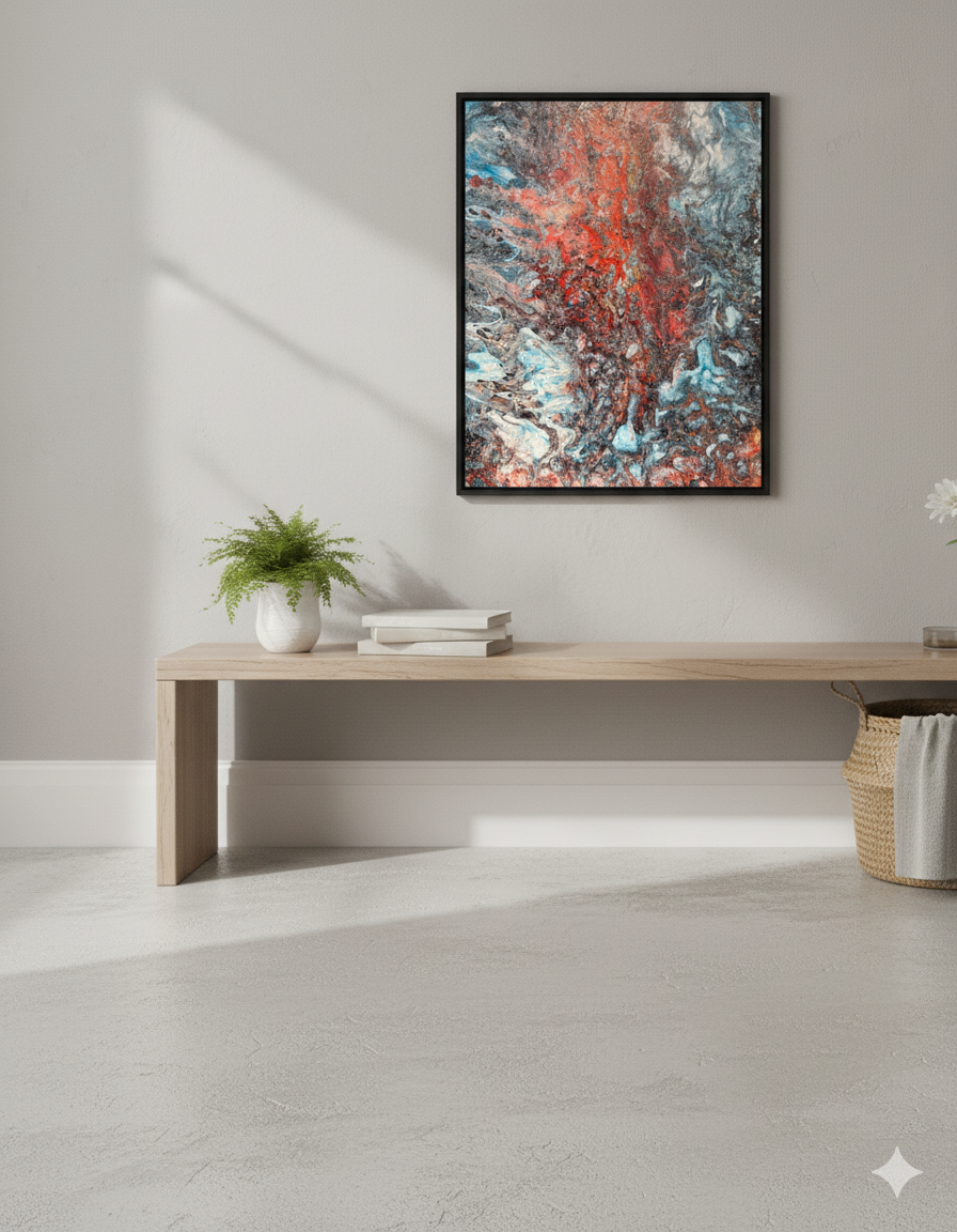 A highly textured, chaotic abstract dominated by a central scorched red/orange column. It's surrounded by churning icy blue, black, and white fluid textures, suggesting intense heat and elemental conflict.